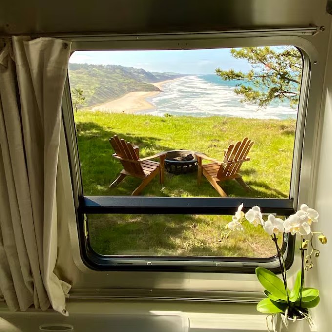 A private romantic setting with gorgeous beach views and luxe accommodation in an Airstream on 9 secluded acres.
