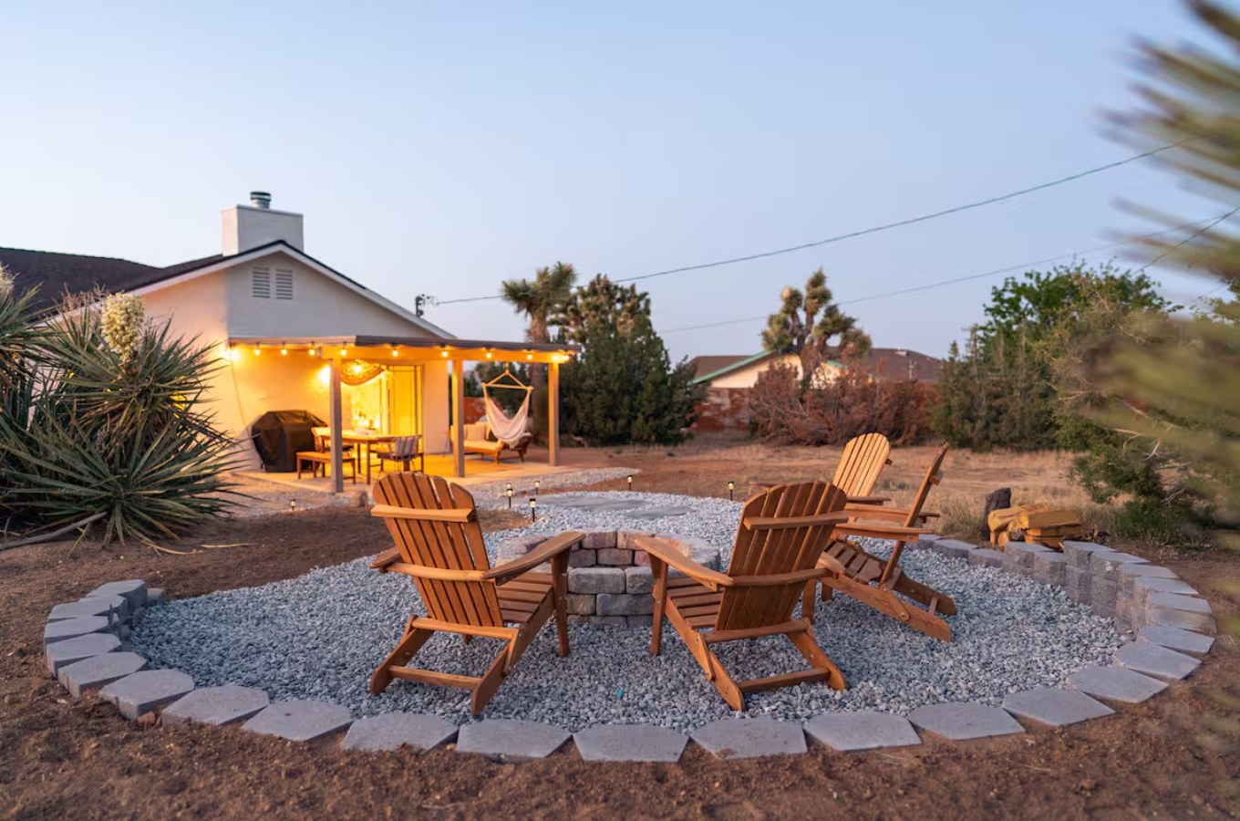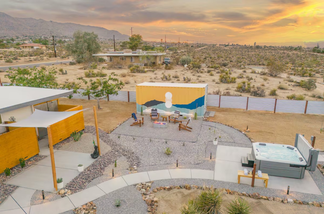 Soak beneath the stars in the hot tub, stretch on the shaded yoga pad, and unwind by the mural-lit fire pit as the Milky Way glows above.