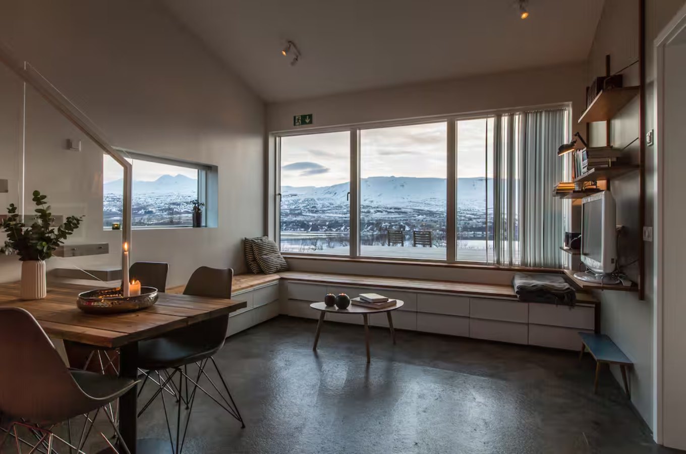 This northern Iceland architectural house in Vaðlaheiði near Akureyri (which is a hotspot for live music and art galleries) has room space for up to four guests.